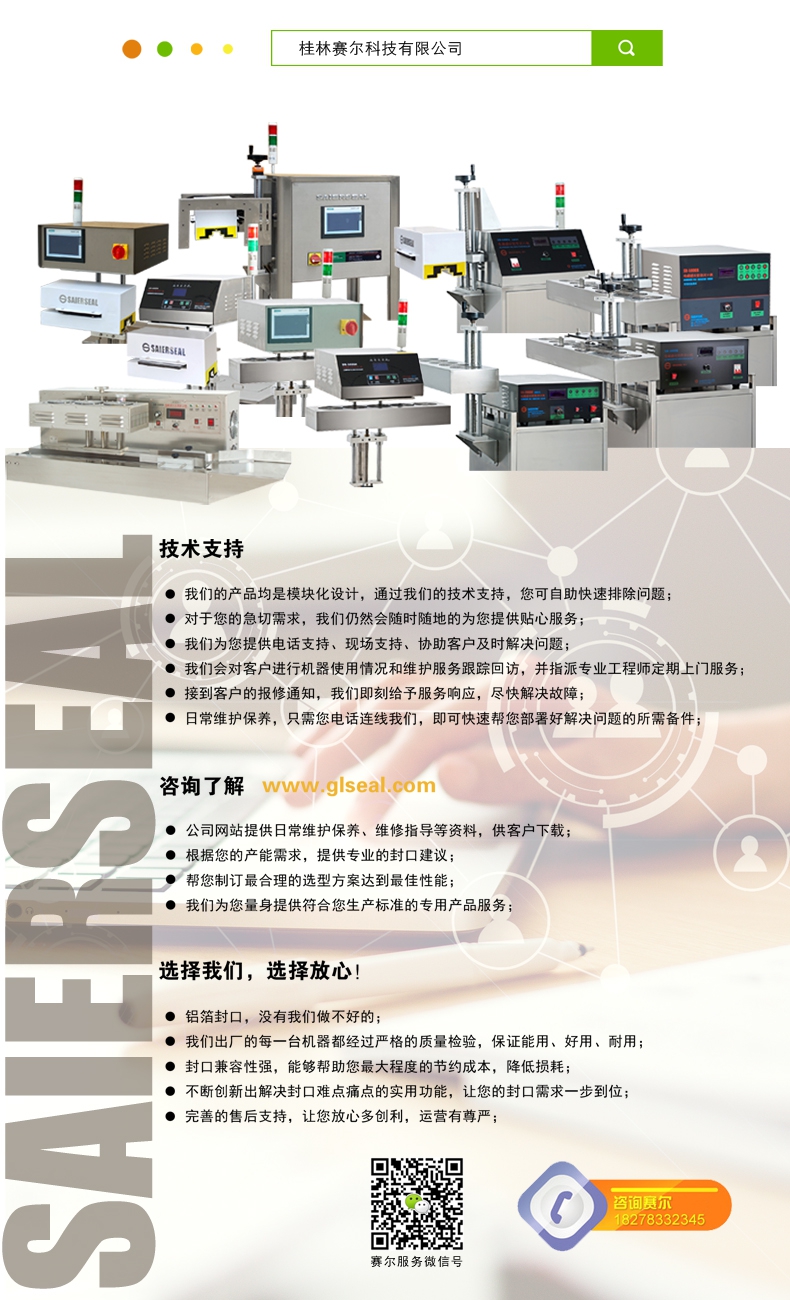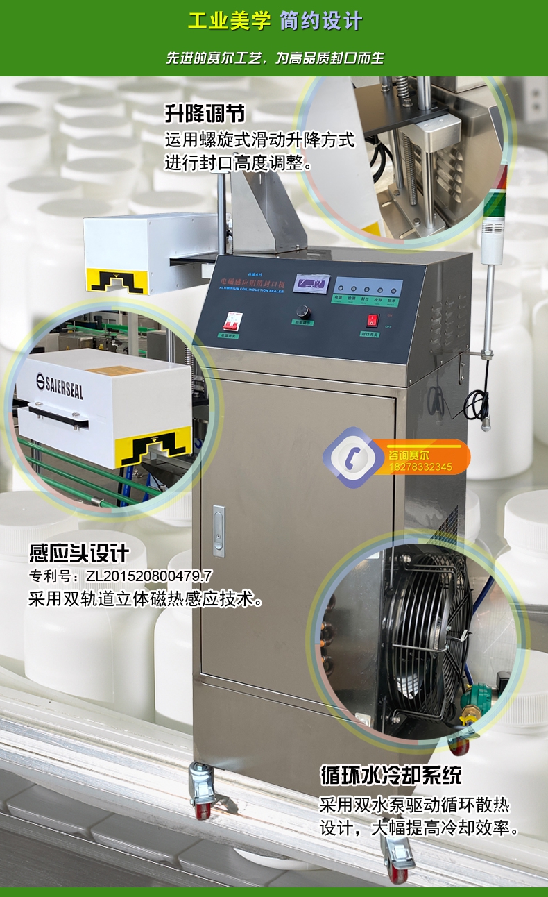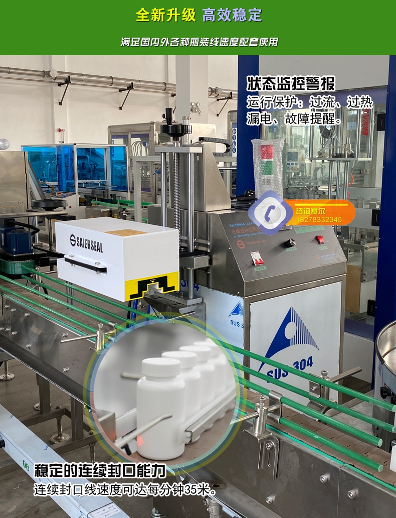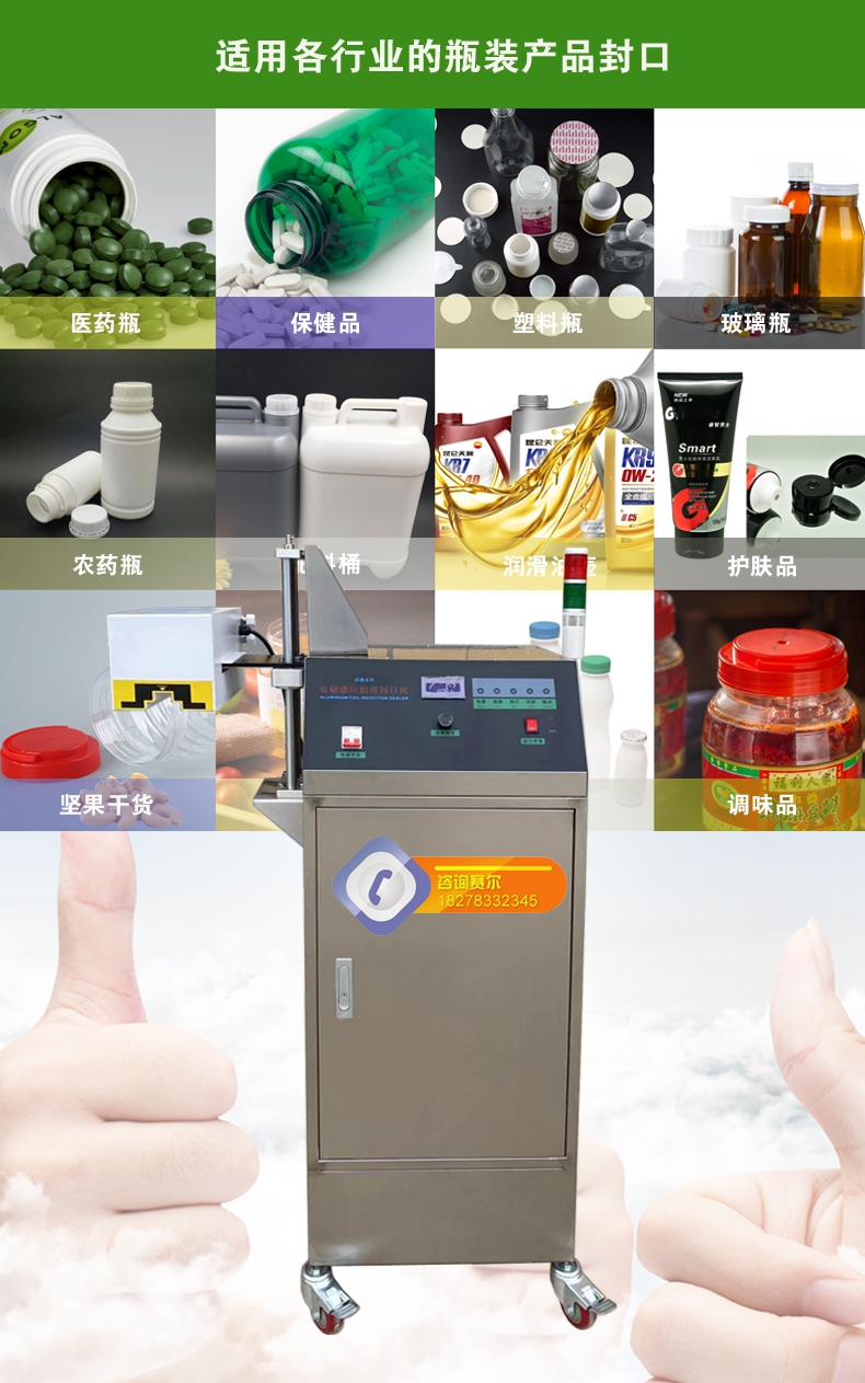 本機型封口通用性強,配置先進,操作簡單,滿足瓶裝線的連續(xù)封口要求,可針對不同化工物料的性狀特點進行封口強度調(diào)節(jié),達到美觀牢固的產(chǎn)品密封目的;本型號參照美系進口鋁箔封口機的技術指標,結合國內(nèi)化工廠普遍的封口需求進行技術升級,做到了穩(wěn)定性好、兼容性高、使用率強,并具備抗磁干擾、耐腐防潮、漏電保護、異常報警等多項先進功能,是一款能達到嚴格封口,滿足自動瓶裝線可靠封口的電磁感應鋁箔封口機。